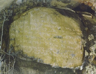 Hibben was convinced that the inscription is ancient and thus authentic. He reported to Tabor that he first saw the text in 1933. At the time it was covered with lichen and patination and was hardly visible. He was taken to the site by a guide who had seen it as a boy, back in the 1880s. George Moorehouse, a professional geologist said that an age of 500 to 2000 years or even more would not be an unreasonable estimate of its antiquity. The inscription uses Greek and Hebrew counterparts but a very ancient form of the letter Aleph.